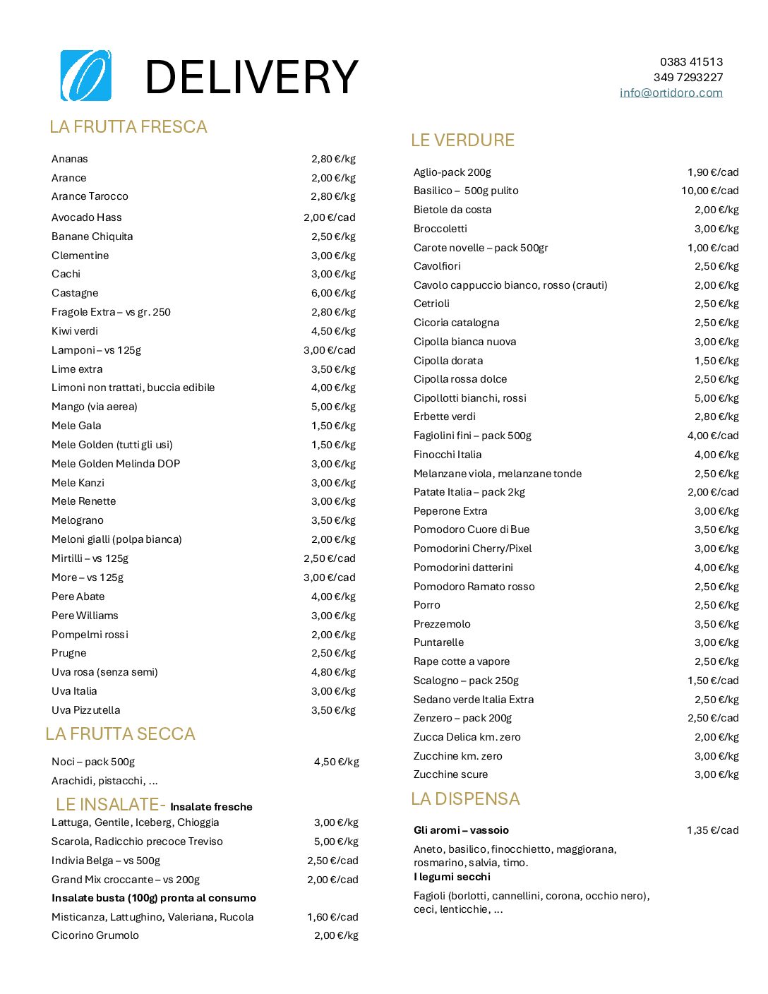 Il nostro listino per il delivery